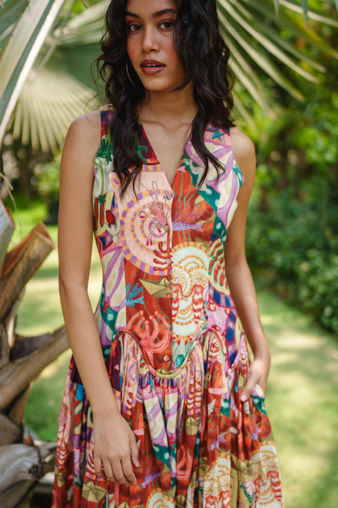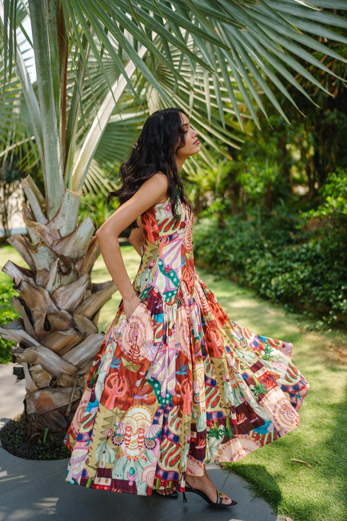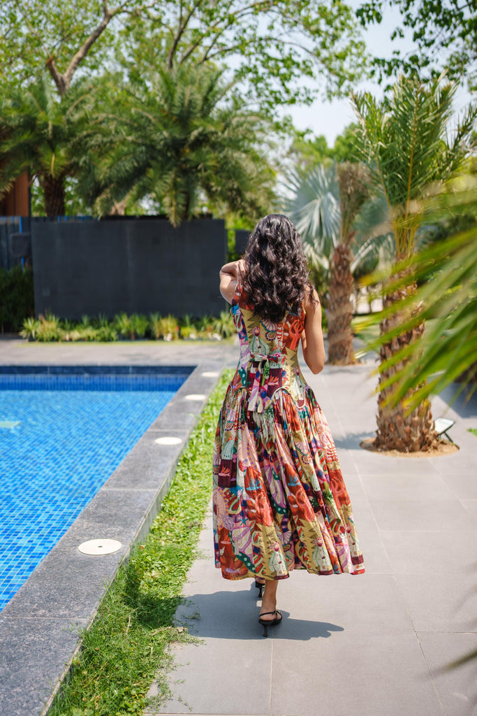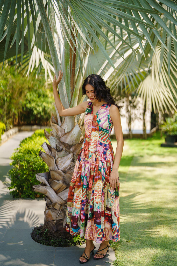 Crafted in our signature soft cotton slub, the dress features a sculpted V-neck bodice with delicate buttons that lead to a gentle curve at the high-hip, where it opens into a voluminous, gathered skirt. The back is cinched with a bow for subtle shaping, making it flattering, feminine, and fuss-free. With deep pockets and an ankle-grazing hem, it's the ultimate vacation dress—lightweight, joyful, and endlessly easy to wear from golden hour strolls to candlelit dinners.