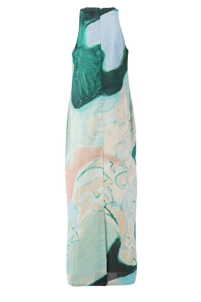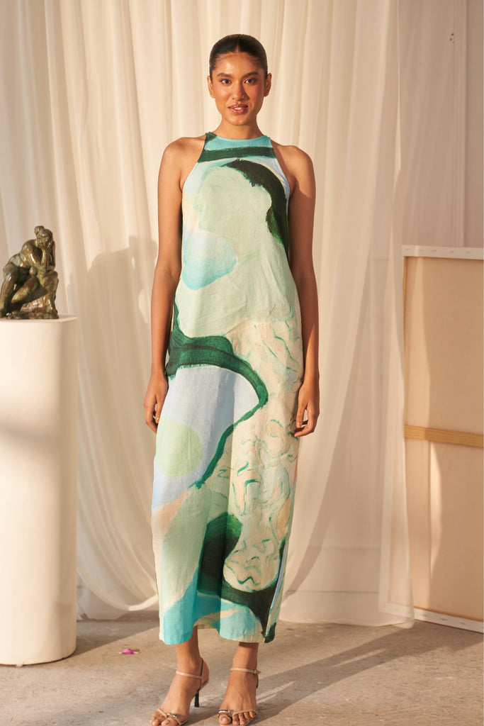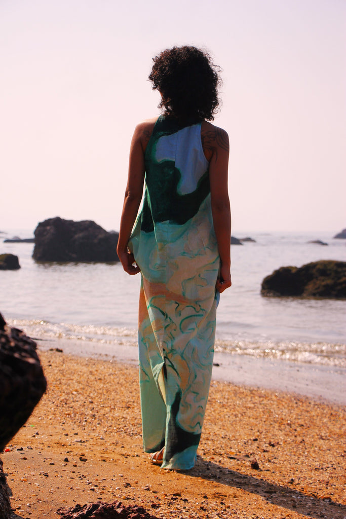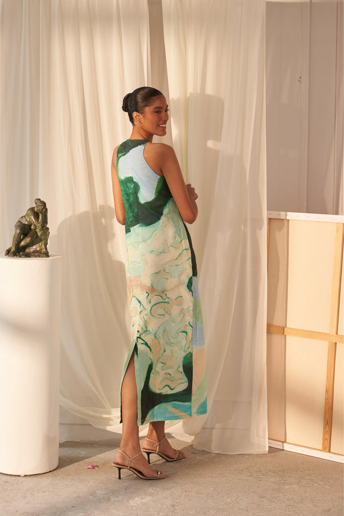 Designed for effortless sophistication, the racerback silhouette drapes beautifully with a relaxed fit, side slits for graceful movement, and a high neckline that adds a touch of modern refinement. Whether worn for sun-drenched holidays or artful evenings out, this dress embodies freedom, artistry, and timeless ease.