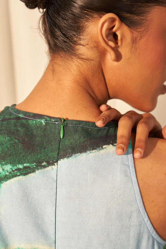 A fluid canvas of bold strokes and soft hues, the Dancing at Midnight Racerback Midi Dress transforms Maria Murphy’s evocative artwork into wearable elegance. Known for her expressive abstract paintings and deep-rooted inspiration from nature, Maria’s art captures movement and emotion in every brushstroke. This dress features her signature color play—shades of seafoam, deep emerald, and cloud blue—creating a dreamy landscape on soft cotton-linen.