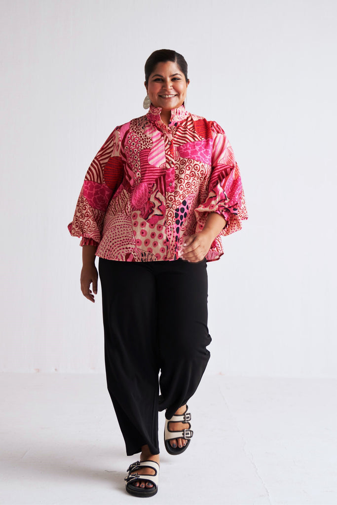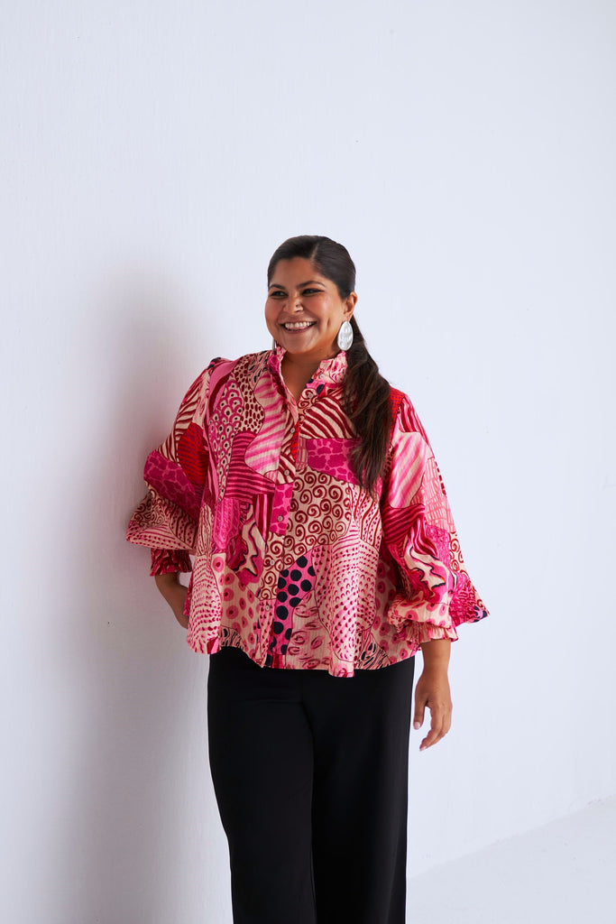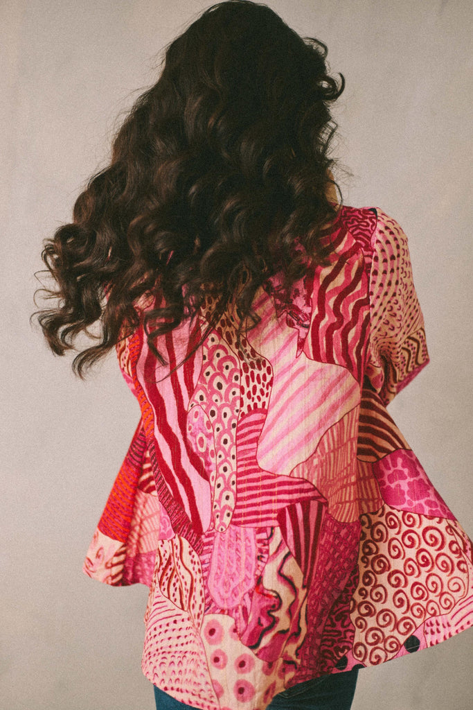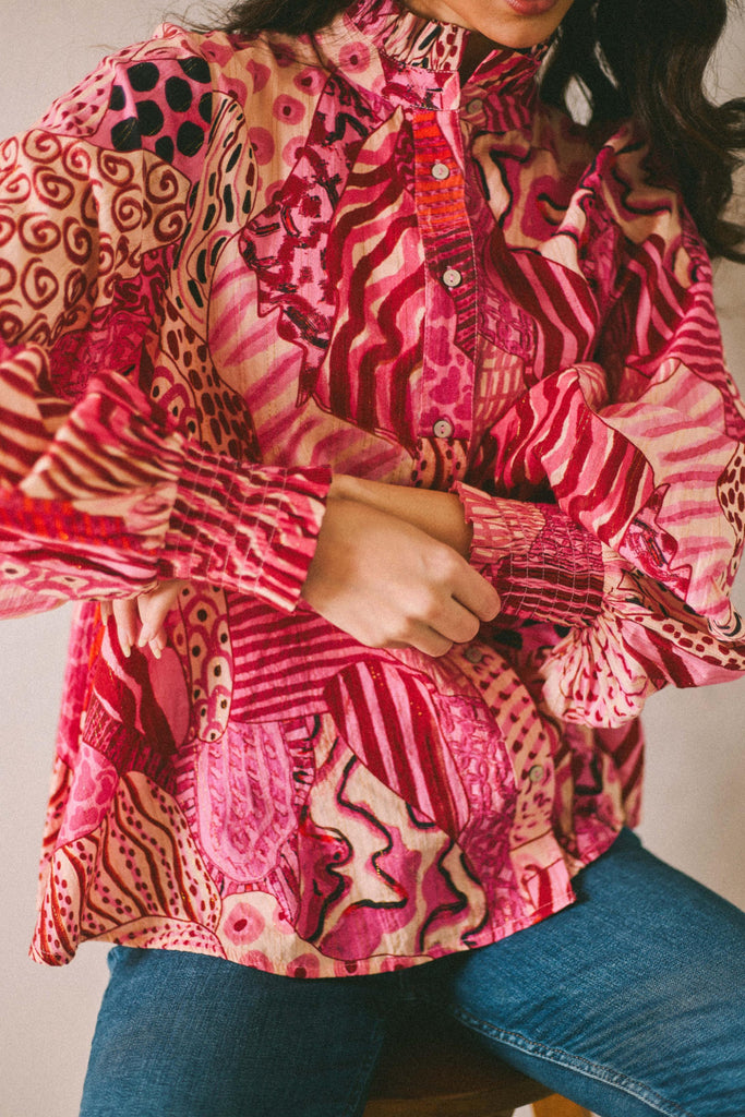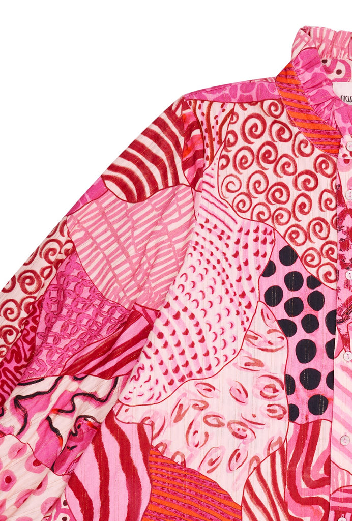 The Gilded Patchwork Top brings boldness and elegance together with a vibrant display of hand-drawn motifs, thoughtfully arranged in a striking patchwork of fuchsia, blush, and deep berry tones. Crafted from luxurious cotton and woven with delicate gold metallic threads, this top adds a touch of sparkle to elevate your everyday look. The intricate print—featuring swirls, dots, and playful shapes—is designed to draw the eye, creating a visual story that feels as unique as it looks.