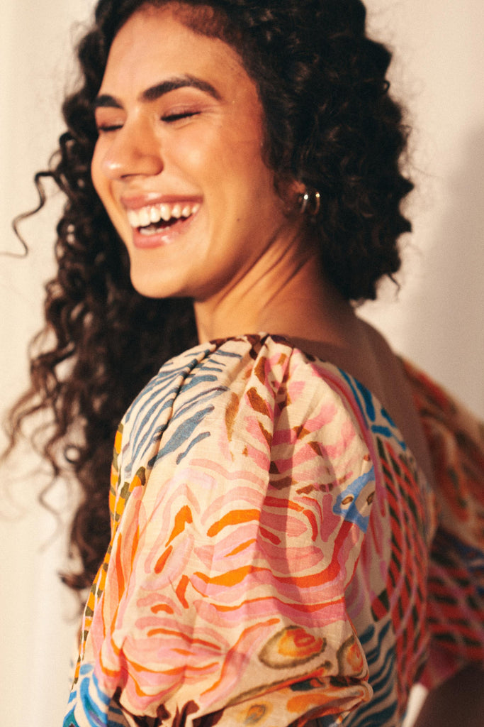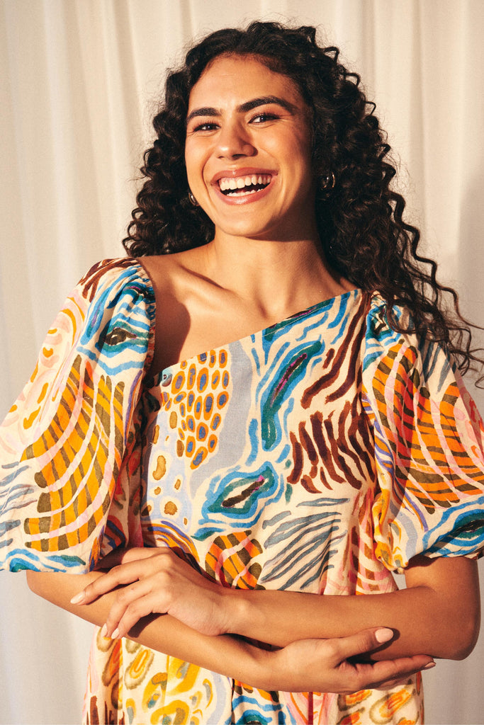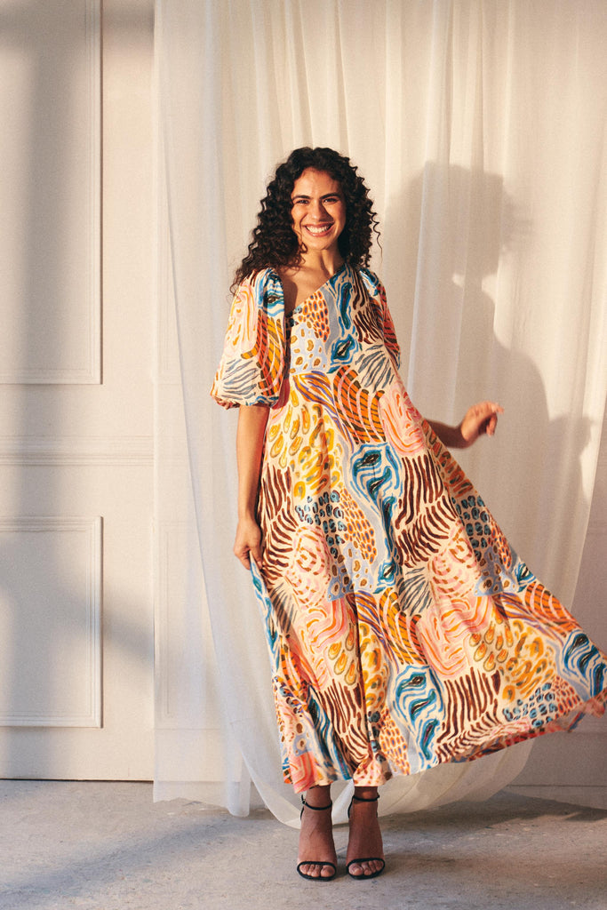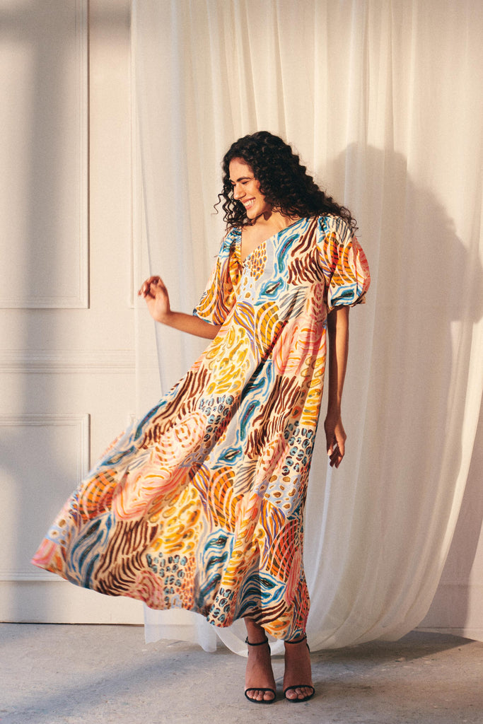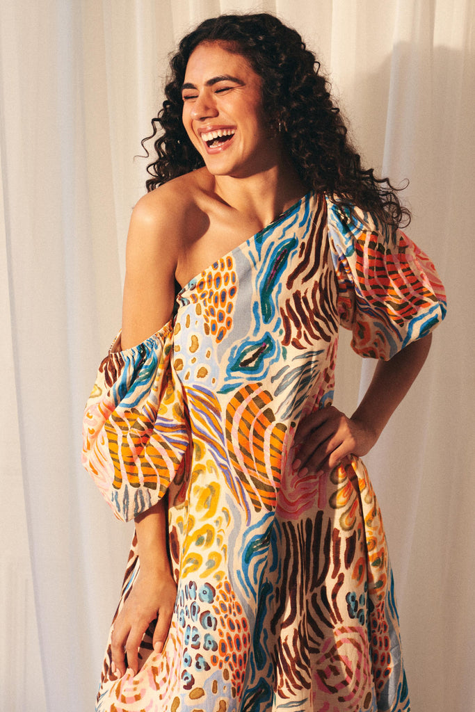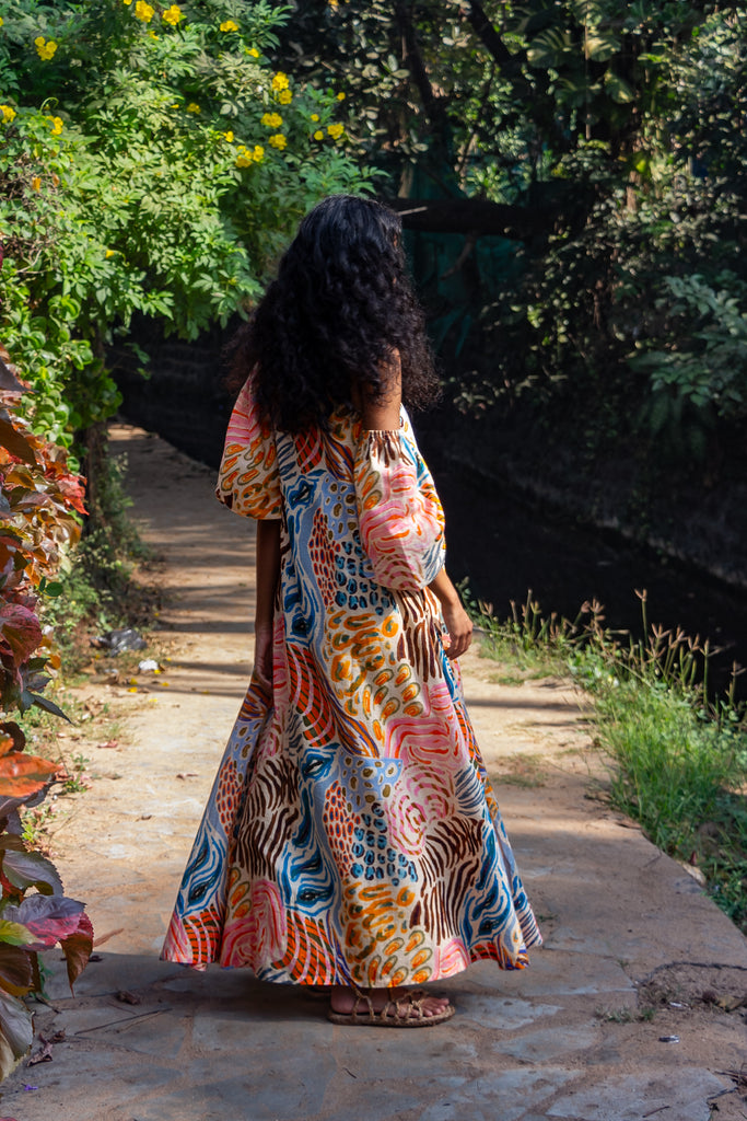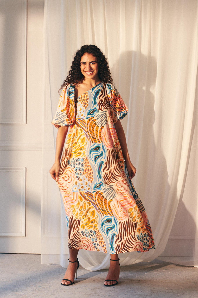 The Savanna Strokes Asymmetric Maxi Dress is a celebration of color and effortless style. Crafted from breathable cotton, it features a bold animal-inspired print in a sun-drenched palette of pinks, yellows, oranges, and blues. Designed with an effortless asymmetric neckline, it can be worn both on or off the shoulder, adapting seamlessly to your mood. Voluminous puff sleeves add a touch of drama, while the flowing maxi silhouette ensures comfort with every step. Whether styled barefoot for a relaxed resort look or paired with heels for an elevated evening ensemble, this dress is your go-to for effortless sophistication.