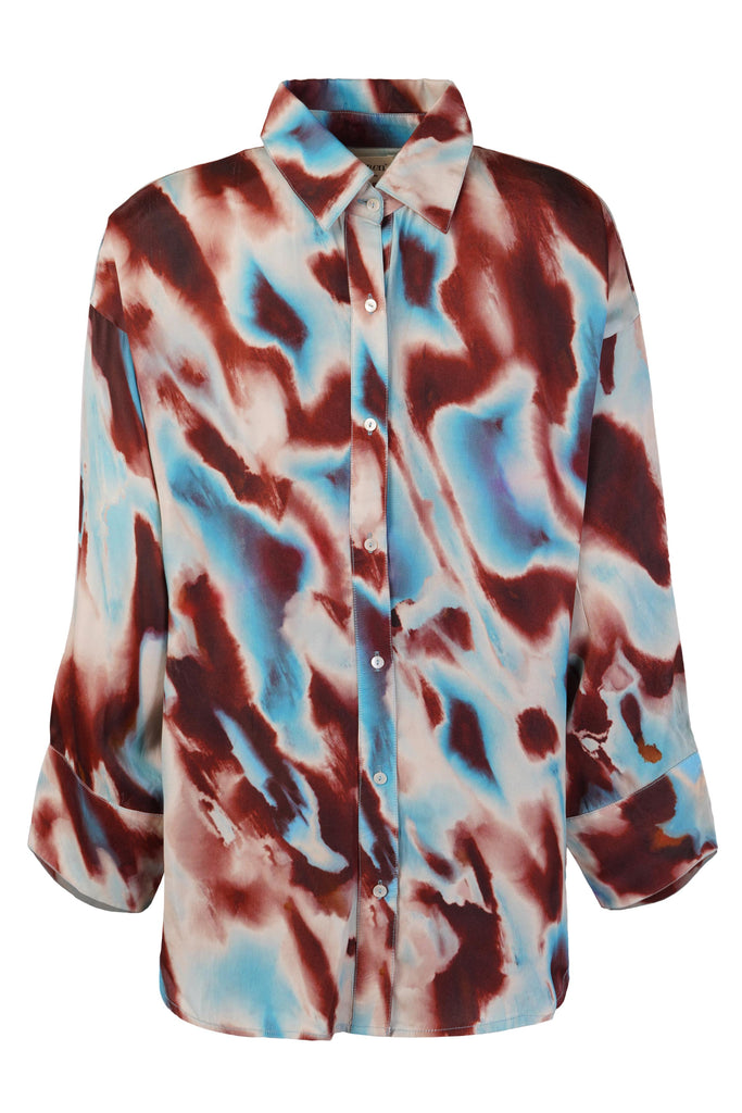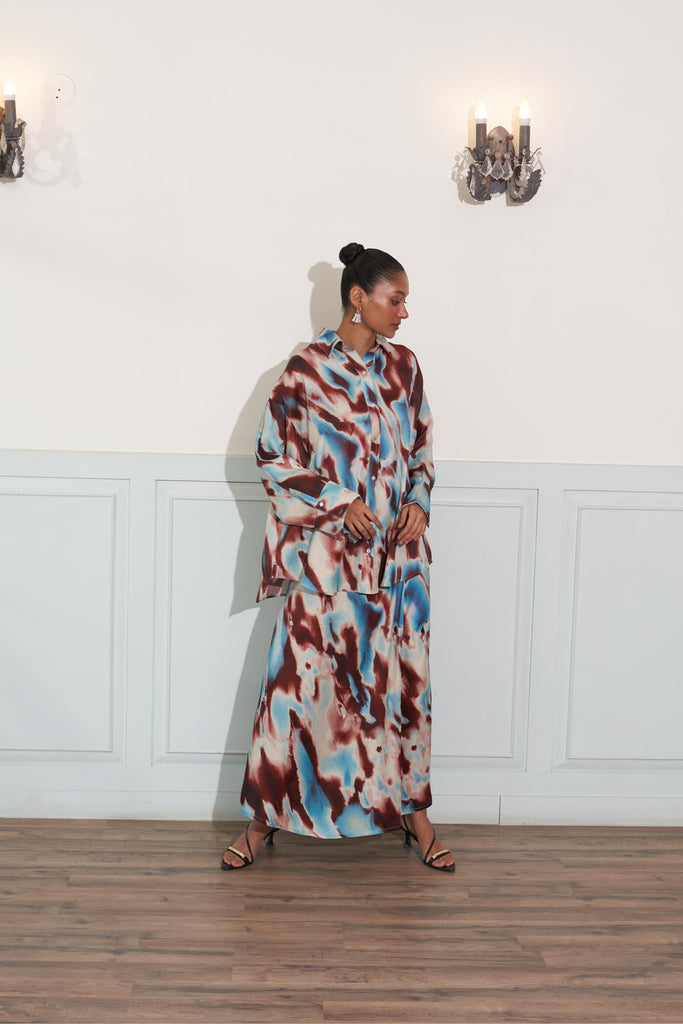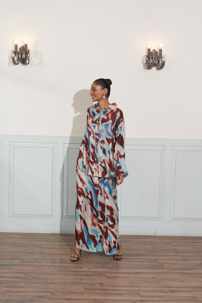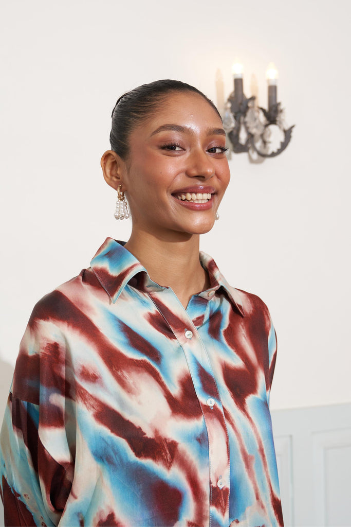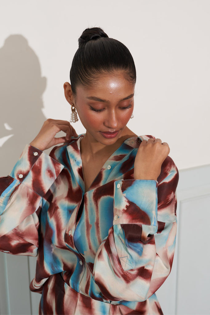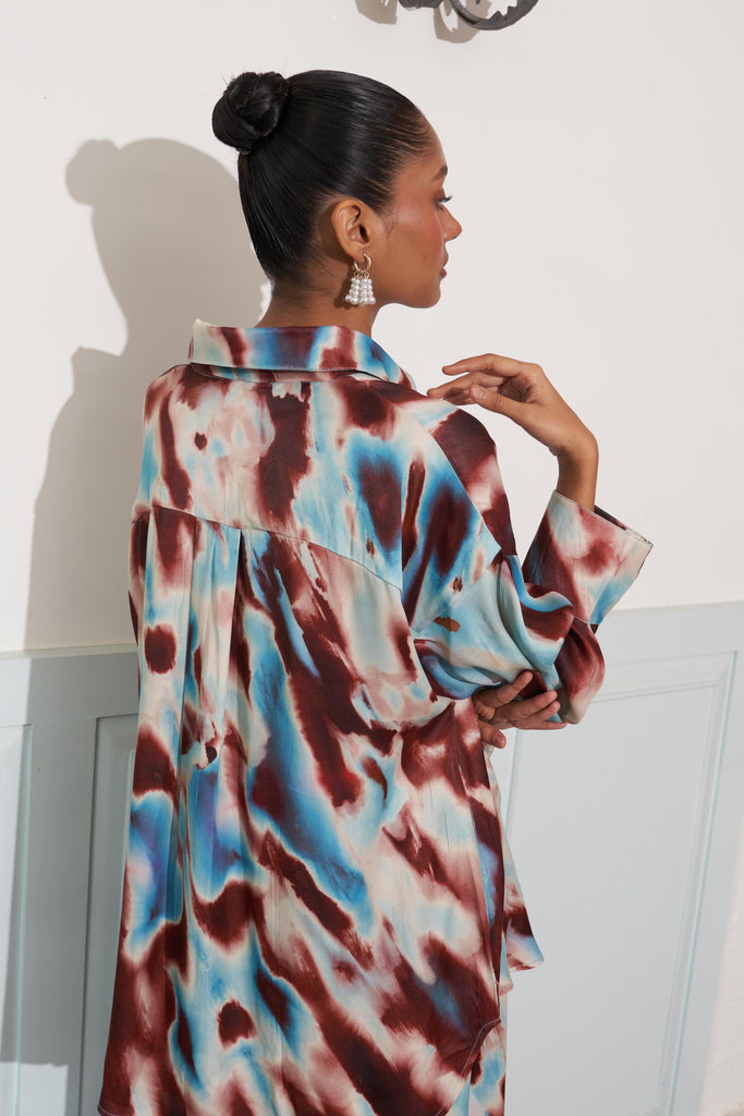 From desk to dinner, or weekend strolls to date nights, the Blue Cocoa Swirl Satin Oversized Shirt adapts beautifully to every moment.