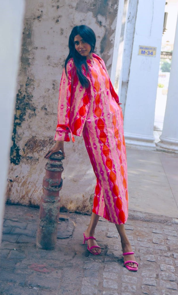 - Bold Print: A lively, hand-painted abstract design in fuchsia and red—because who says casual can’t be striking?