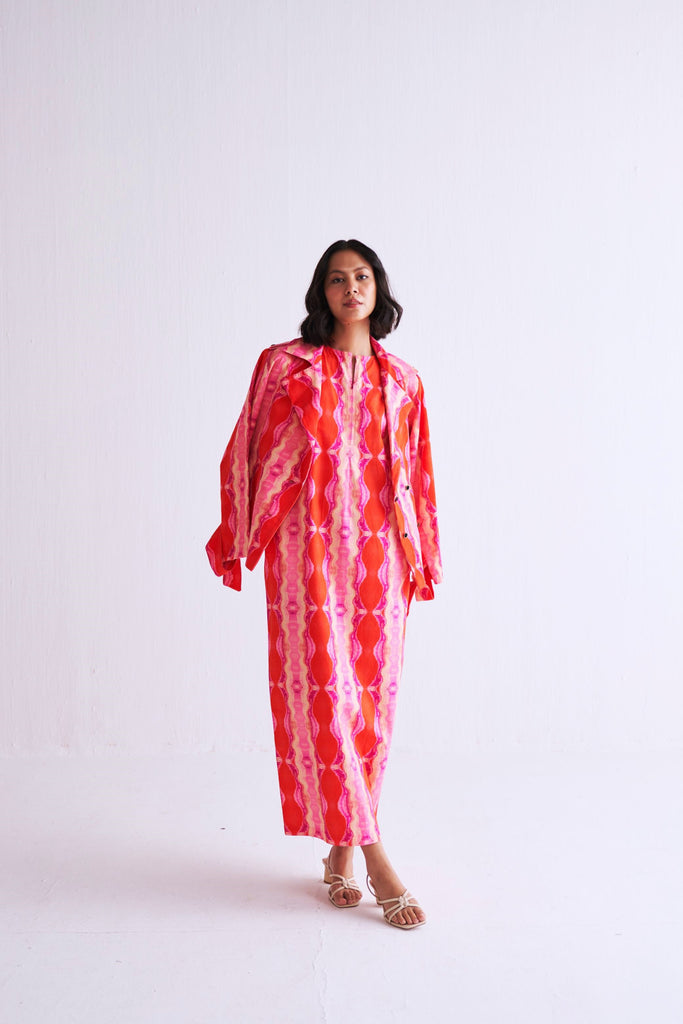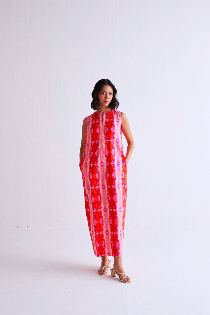 Brighten up your wardrobe with the Fuchsia Flame Dress—a true showstopper in vibrant red with hints of a fuchsia flame. This hand-painted abstract print is full of energy and artistic flair, making it perfect for days when a little extra color is exactly what you need. The relaxed, straight-cut silhouette offers effortless chic, while the high neckline and clean lines let the bold colors do all the talking. And yes, there are pockets—just because we know you’ll love them.