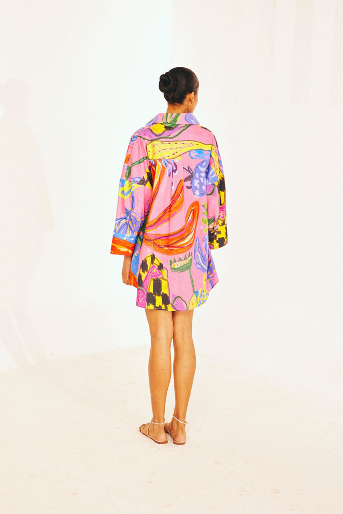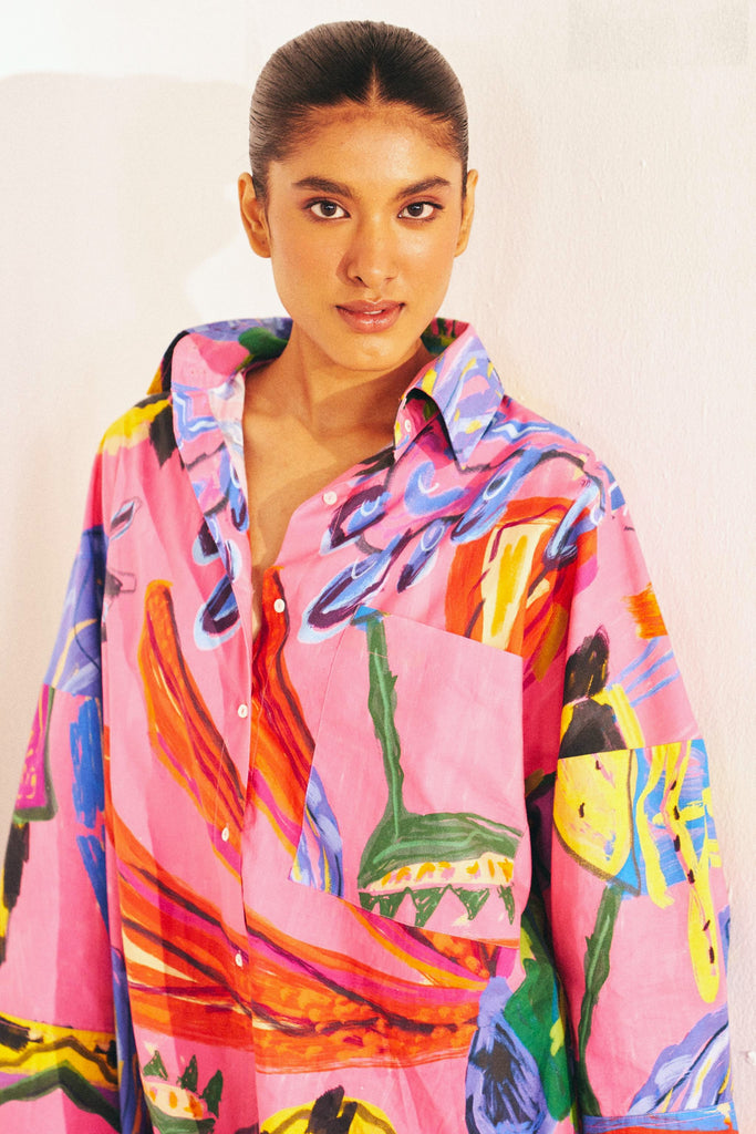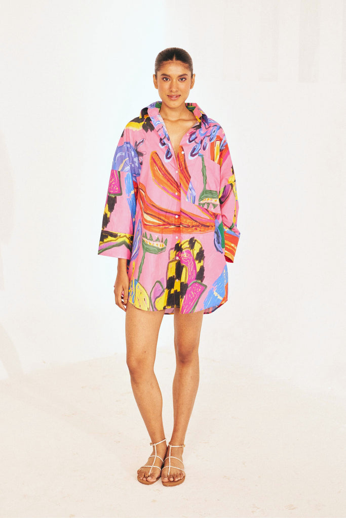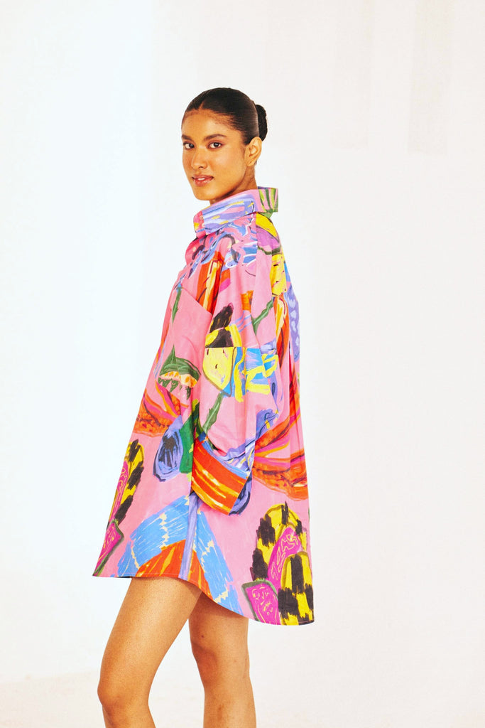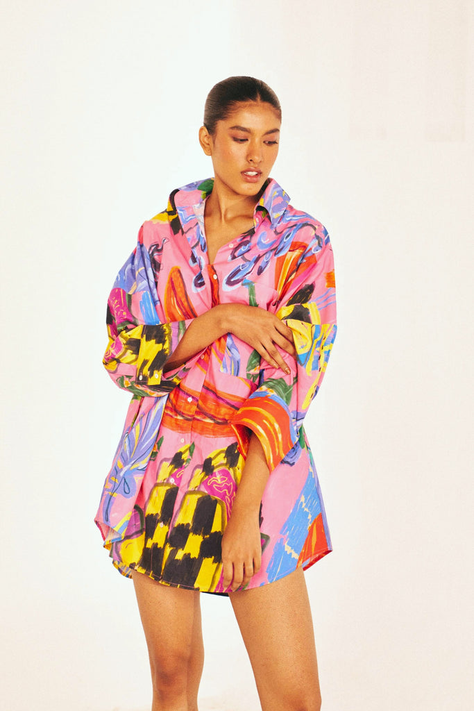 A little drama, a lot of ease. The Electric Bloom Short is our fresh take on the classic playsuit—an oversized shirt with built-in shorts for carefree movement. Designed in our Electric Bloom print, a hand-drawn explosion of bold florals and expressive brushstrokes, this piece is crafted in breathable cotton poplin for all-day comfort. The structured high collar, relaxed silhouette, and painterly swirls of fuchsia, cobalt, and gold make it a true statement-maker.
