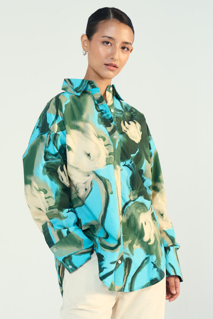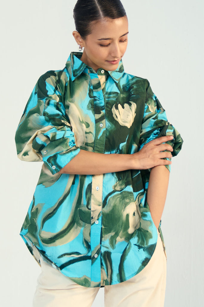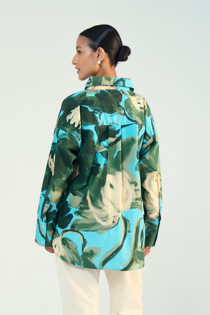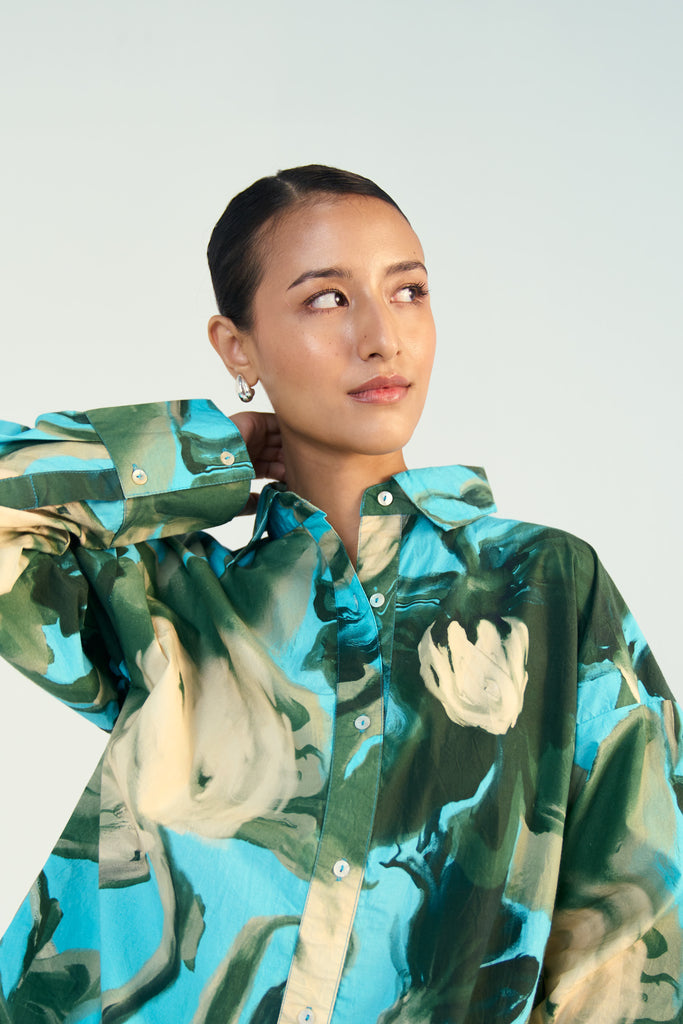 Cut in crisp 100% cotton poplin and printed in our signature Midnight Magnolia artwork, this oversized shirt is equal parts timeless and statement-making. Designed with a relaxed silhouette, full sleeves, and a classic collar, it’s the kind of piece that effortlessly balances comfort and chic.