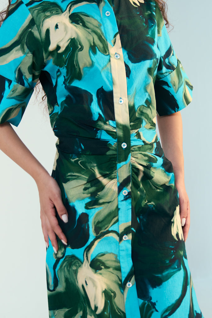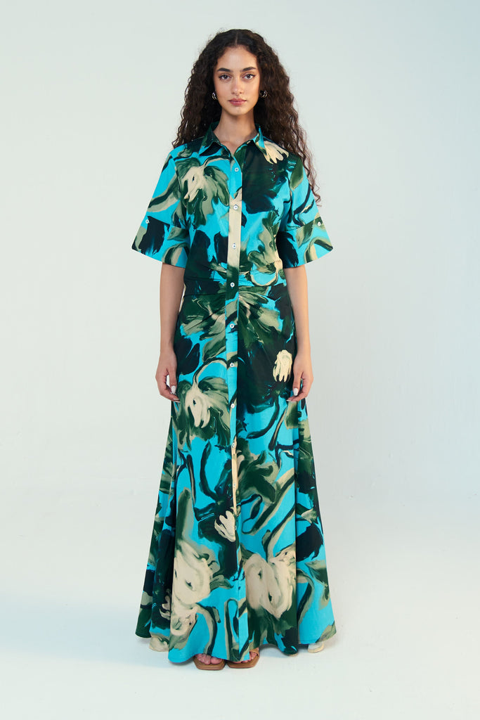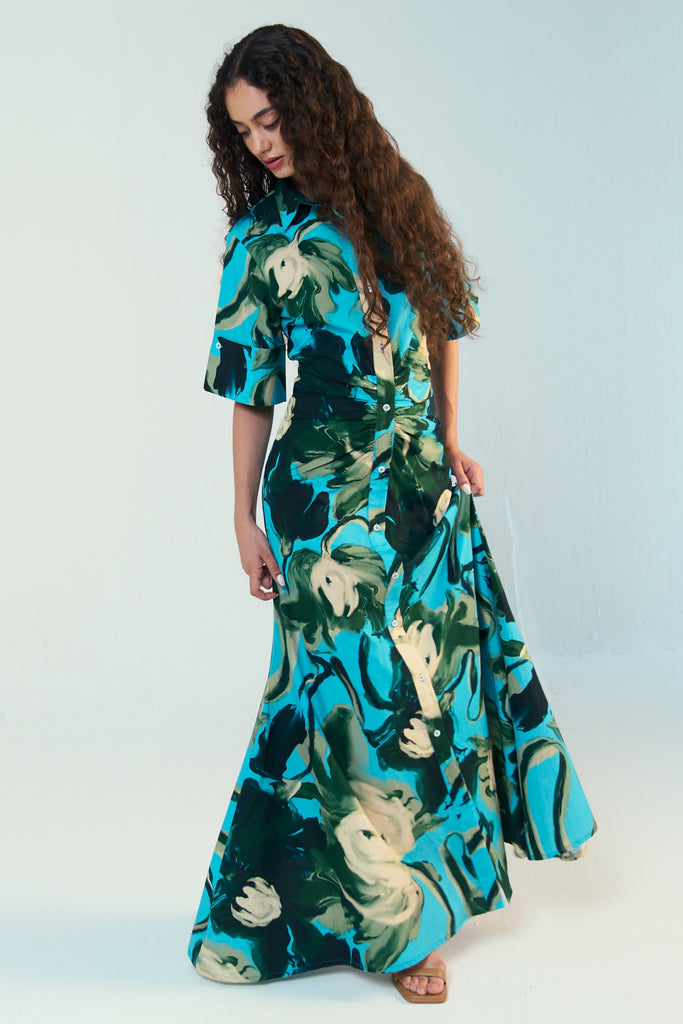 This shirt dress is cut in an hourglass shape—gently structured through the bodice with a sculpted fit at the waist and subtle ruching across the torso to contour and flatter. Designed to mimic the silhouette of a perfectly cinched shirtdress (without ever feeling tight), it then flows into a full-length skirt that moves with you.