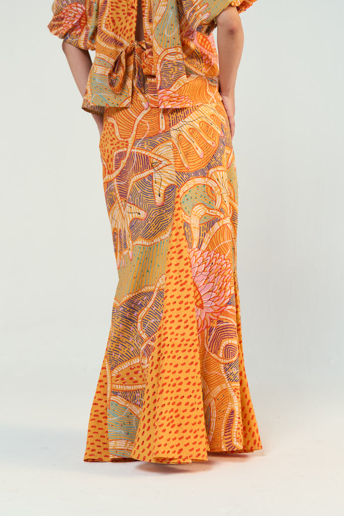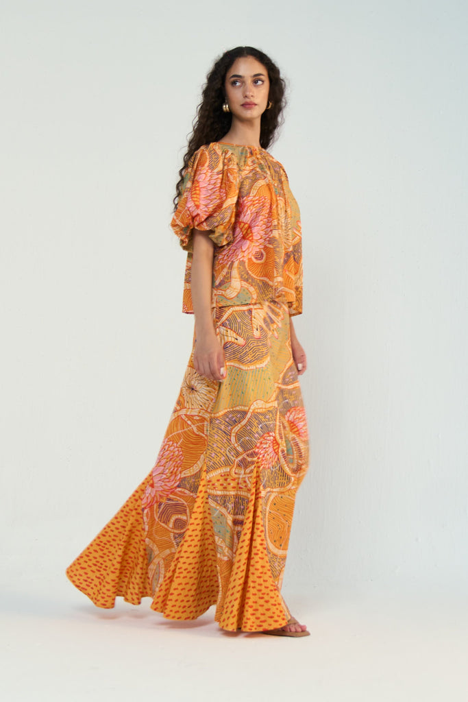 A skirt that sashays with you. The Sunlit Reverie Maxi Skirt is crafted in soft, breathable cotton and tailored to flatter—fitted through the waist and hips before cascading into a flare of dramatic godets at the hem. The clean waistband and smooth silhouette keep it elegant, while the movement-rich shape gives it energy. Pair it with the matching puff-sleeve top for head-to-toe impact, or dress it down with a tucked-in tee and sandals. A warm-weather statement, softened by joy. The hand-painted Sunlit Reverie print—dreamed up by artist Archanaa—captures that gentle hum of joy, like sunlight dancing on closed eyelids or the purring of a content cat.