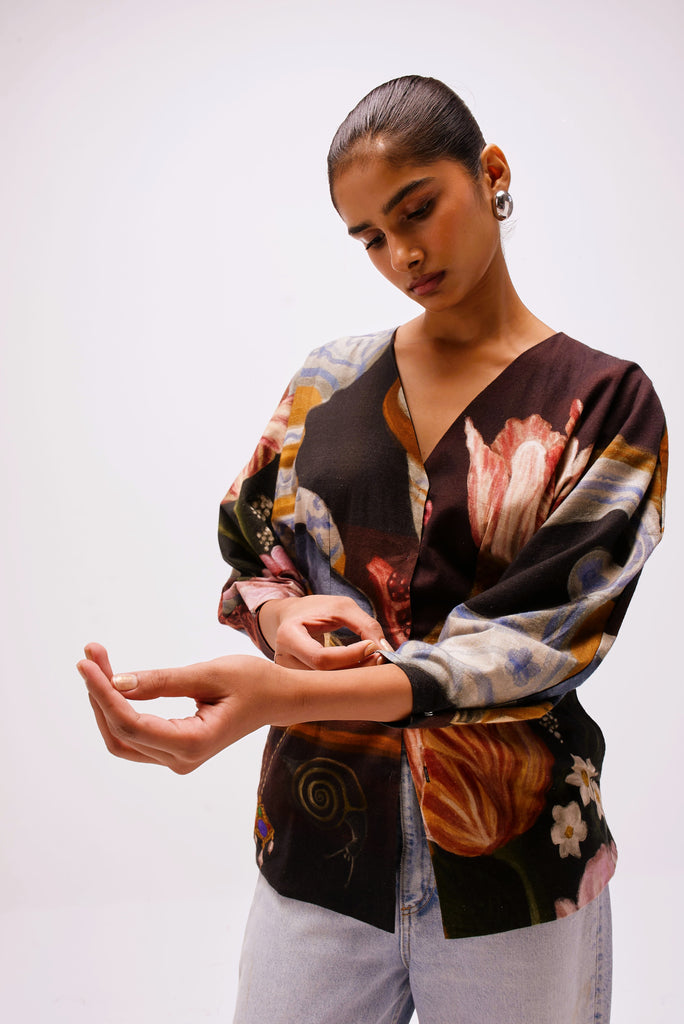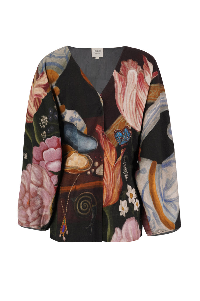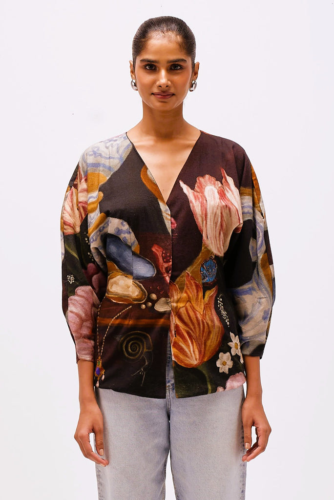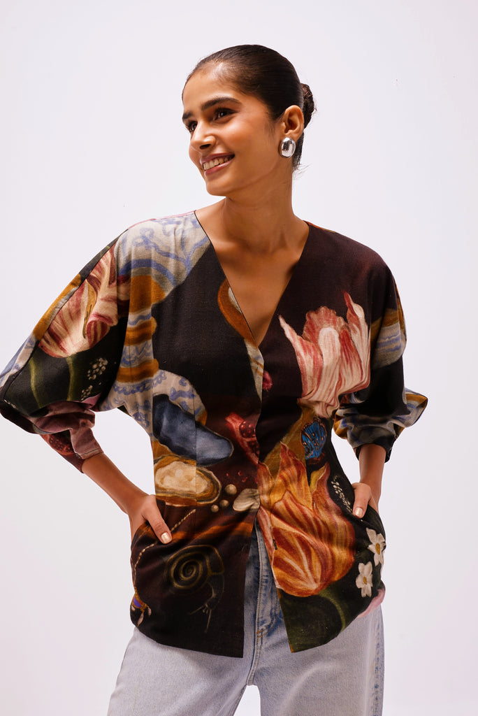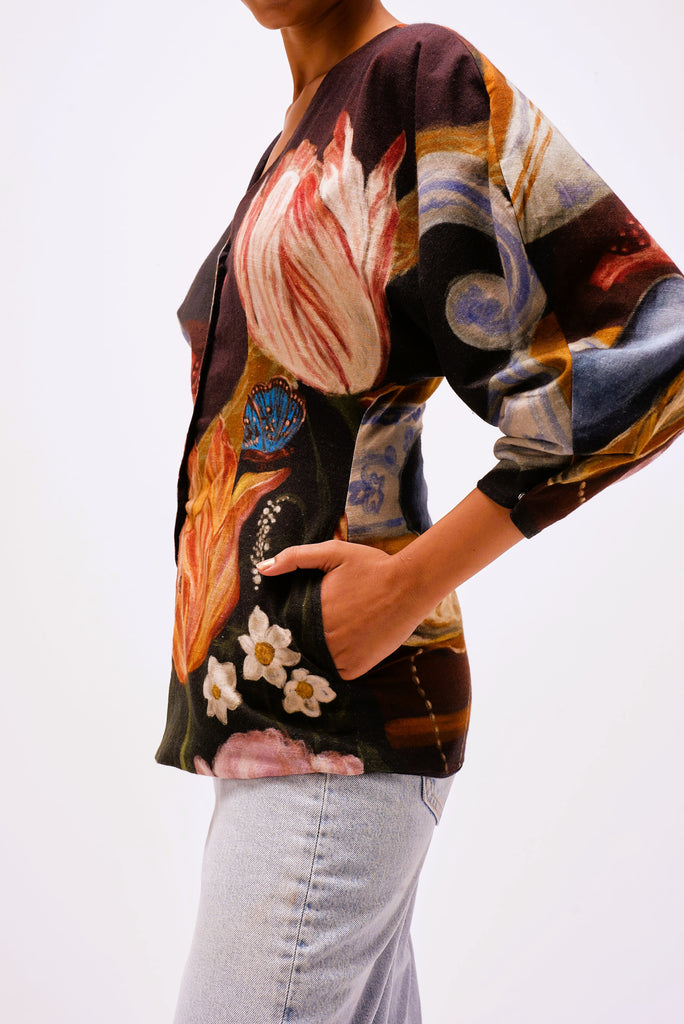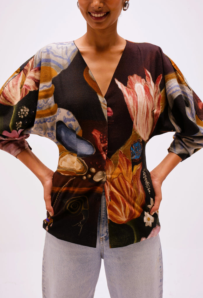 Printed in The Collector’s Garden artwork — inspired by Dutch Golden Age still-life paintings — the top is adorned with hand-painted tulips, porcelain vessels, fruit, butterflies, and heirloom jewels rendered in rich, moody hues. A wearable masterpiece that pairs artful storytelling with everyday versatility.