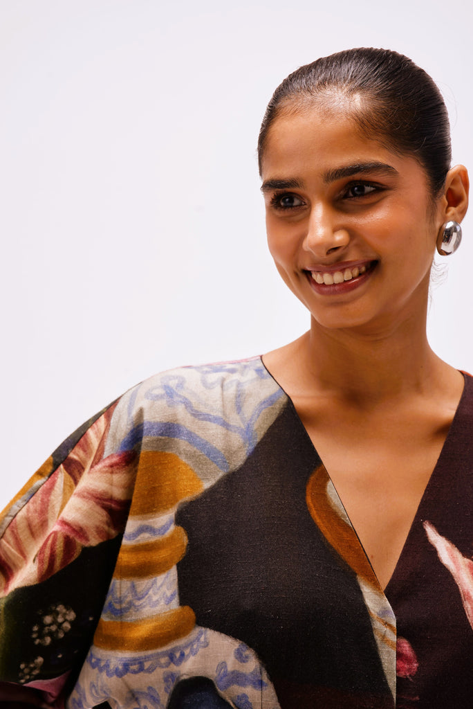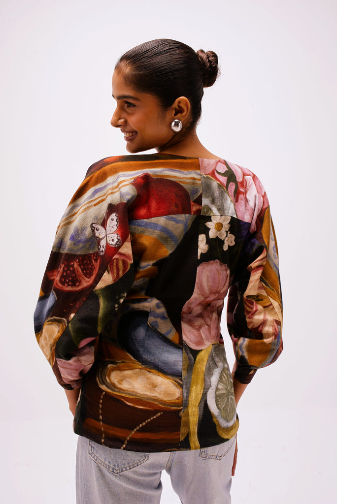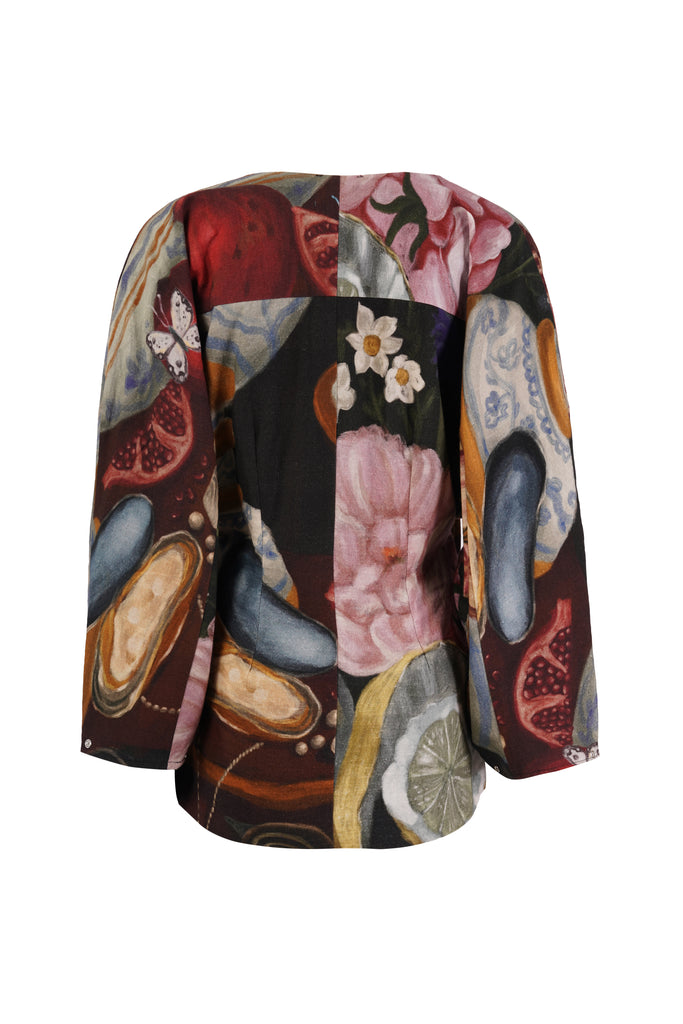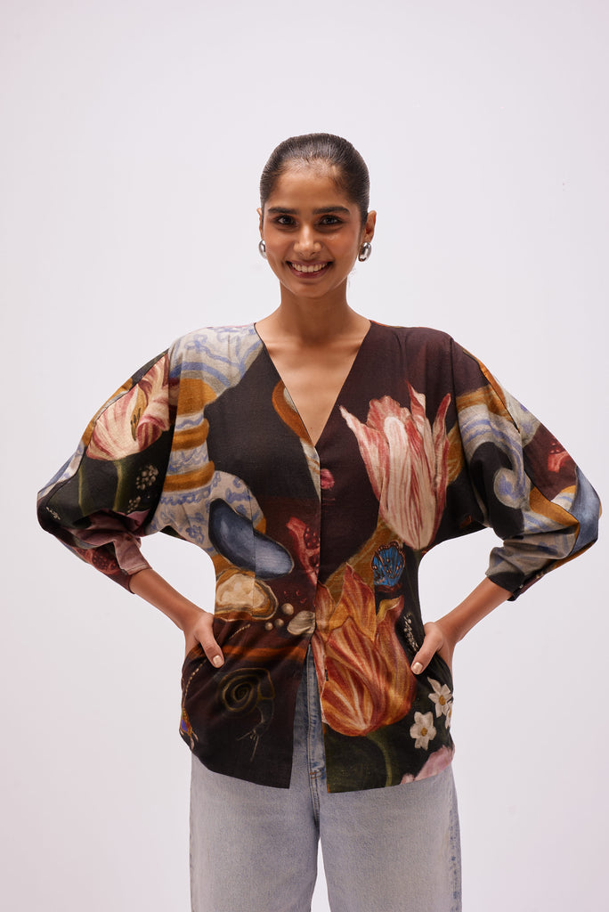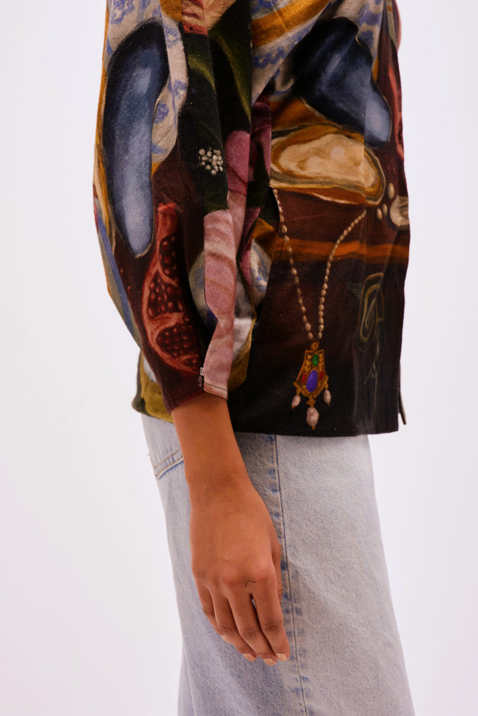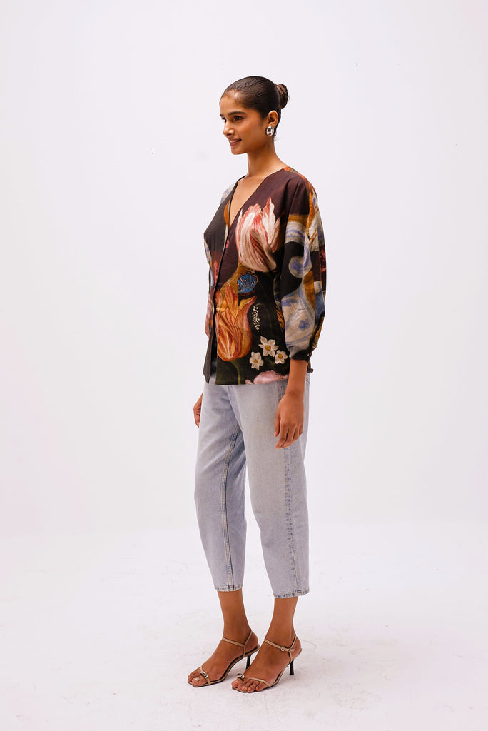 Printed in The Collector’s Garden artwork — inspired by Dutch Golden Age still-life paintings — the top is adorned with hand-painted tulips, porcelain vessels, fruit, butterflies, and heirloom jewels rendered in rich, moody hues. A wearable masterpiece that pairs artful storytelling with everyday versatility.