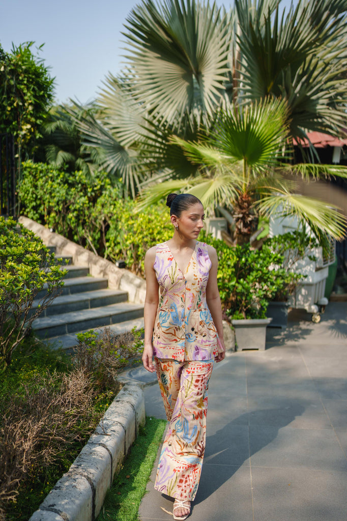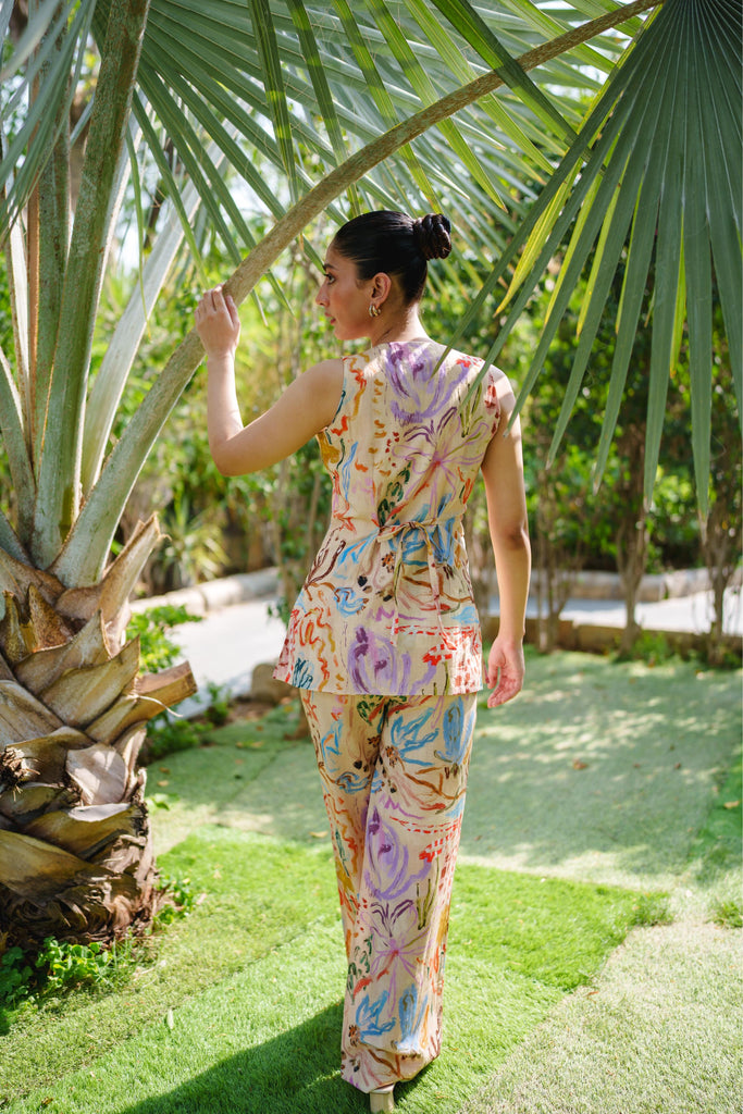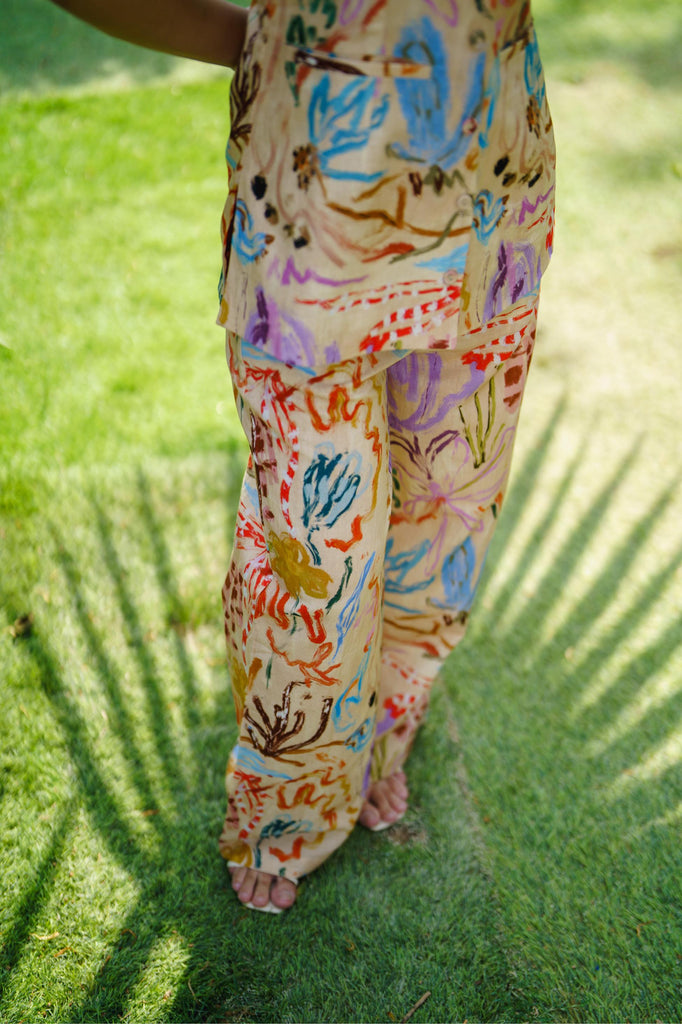The Garden Graffiti Pants are cut in a wide-leg silhouette with a flat front and an elasticated back waistband—because ease is everything. Crafted in a breathable cotton-linen blend, the print features abstract crayon-style florals in bold, joyous strokes of lilac, ochre, cherry red, and sky blue.