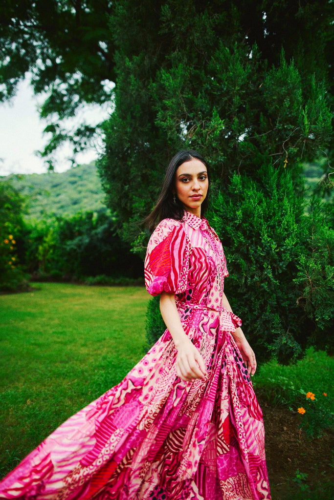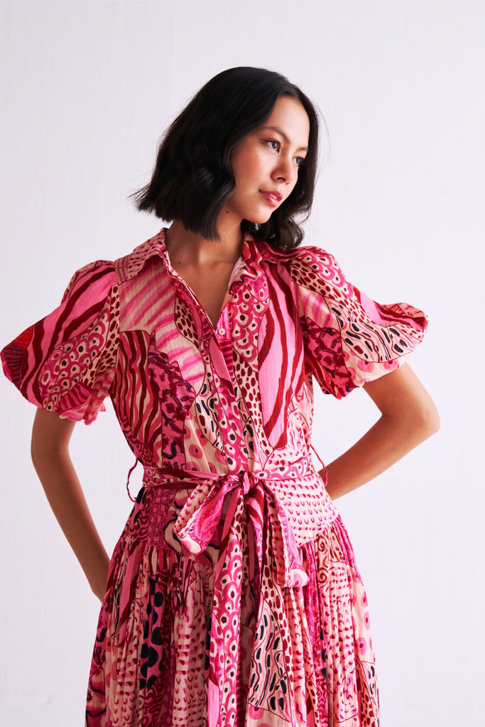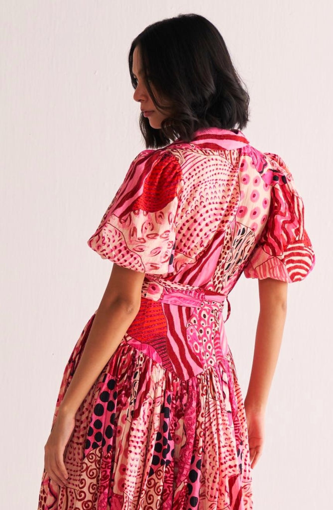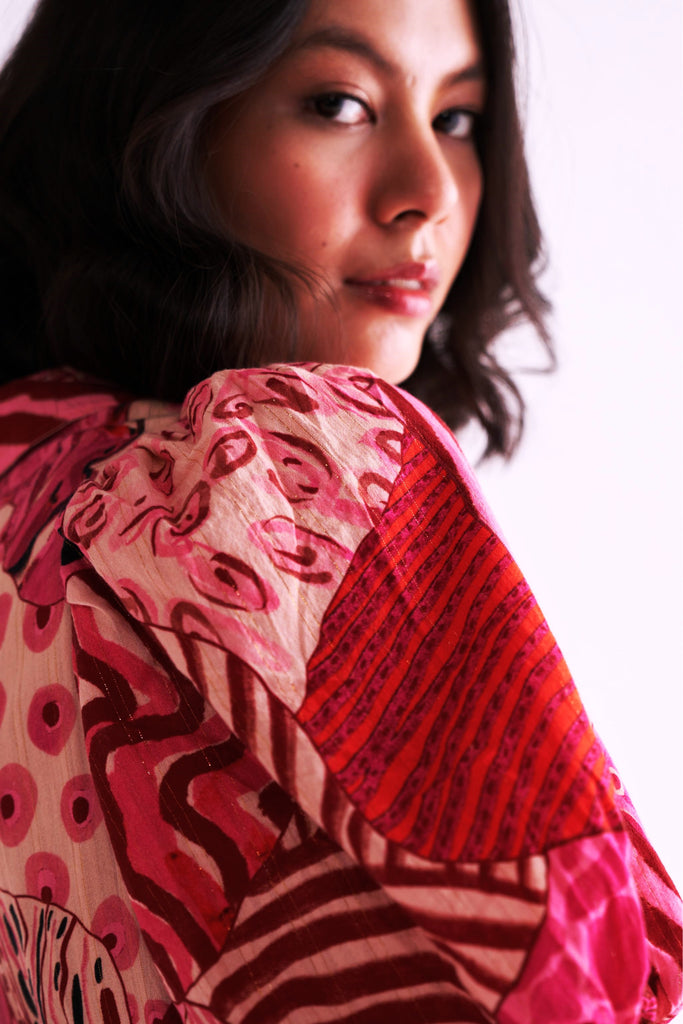 A true showstopper, the Gilded Patchwork Midi Dress is where art meets elegance. This stunning piece showcases an abstract, hand-drawn patchwork print in rich fuchsia, berry, and red tones, intertwined with delicate metallic gold threads that catch the light in the most enchanting way. It’s a dress designed to celebrate colour, texture, and artistry. Each patchwork detail is an intricate blend of organic shapes and playful textures, drawing the eye and adding a sense of depth and movement.